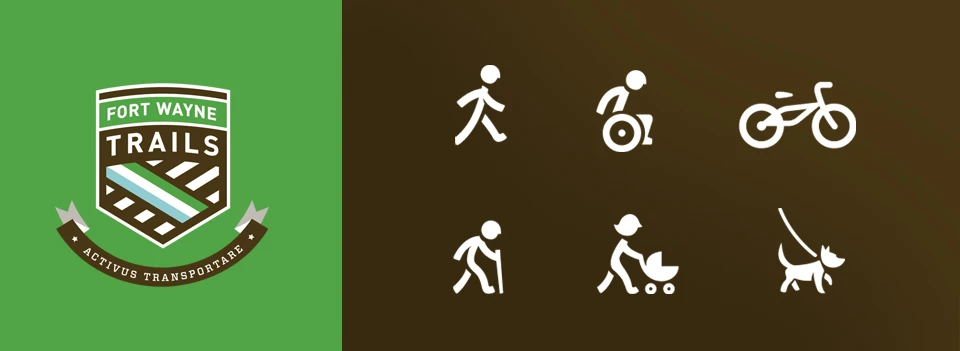 The shield conveys a sense of history and pride in the accomplishments of the preceding organizations, and it evokes the duty Fort Wayne Trails has to carry on their legacy. The simple lines of the logo represent the 66+ miles of trails that meander though our region’s neighborhoods, farms, urban areas and waterways. The icons you see at the top of the page aren’t part of the logo, but they are intrinsic to the branding. This family of icons communicate the friendly, inclusive nature of the trails to people of all languages, ages and backgrounds without without saying a single word.
