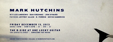 READ MOREUpdate: December 6, 2013: This show has officially SOLD OUT. Thank you for your support of original music and unique venues! Original Post: Mark Hutchins opened the The B-Side’s 2013 schedule of shows with the exceptional Stuntman One show, and we’re [...]