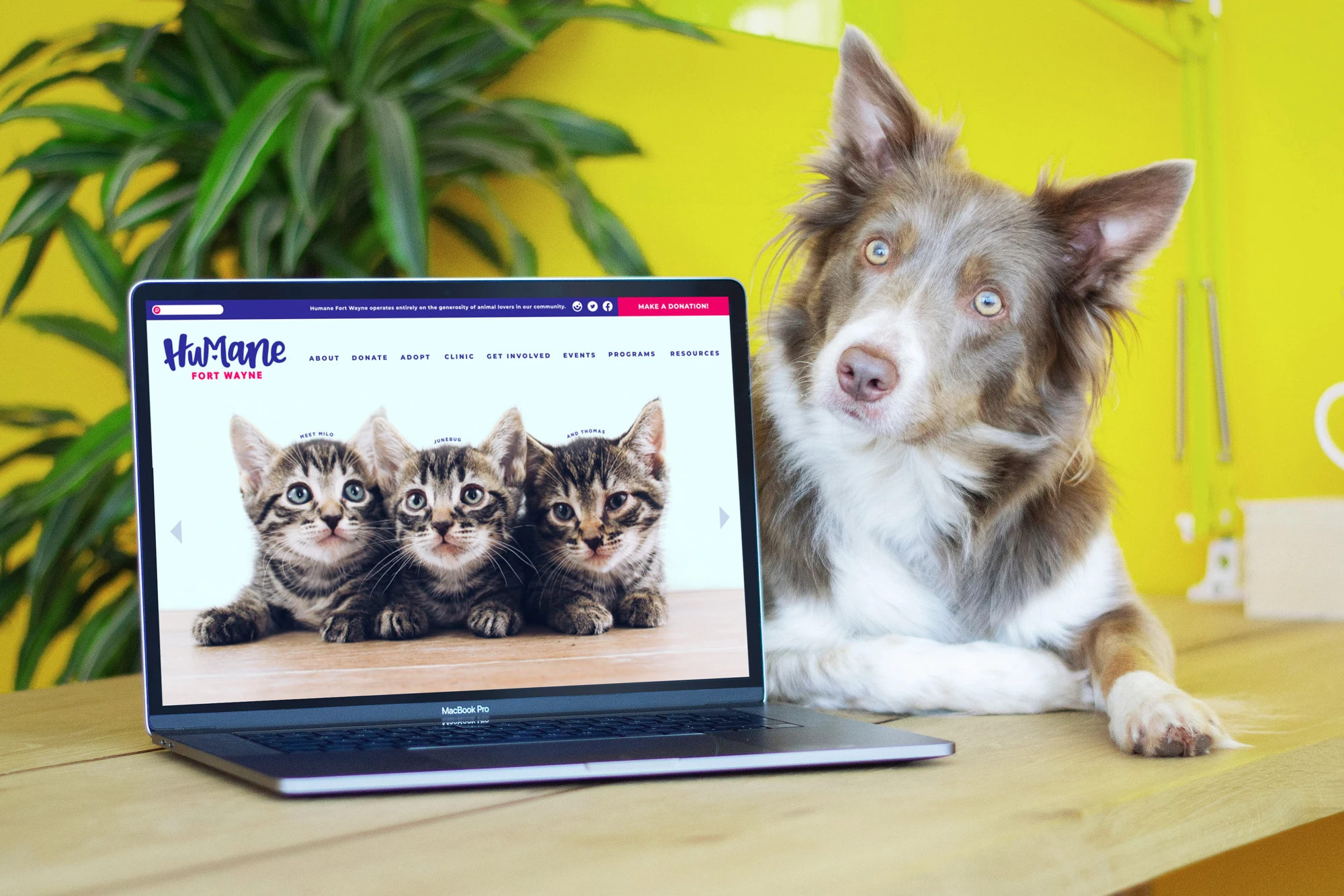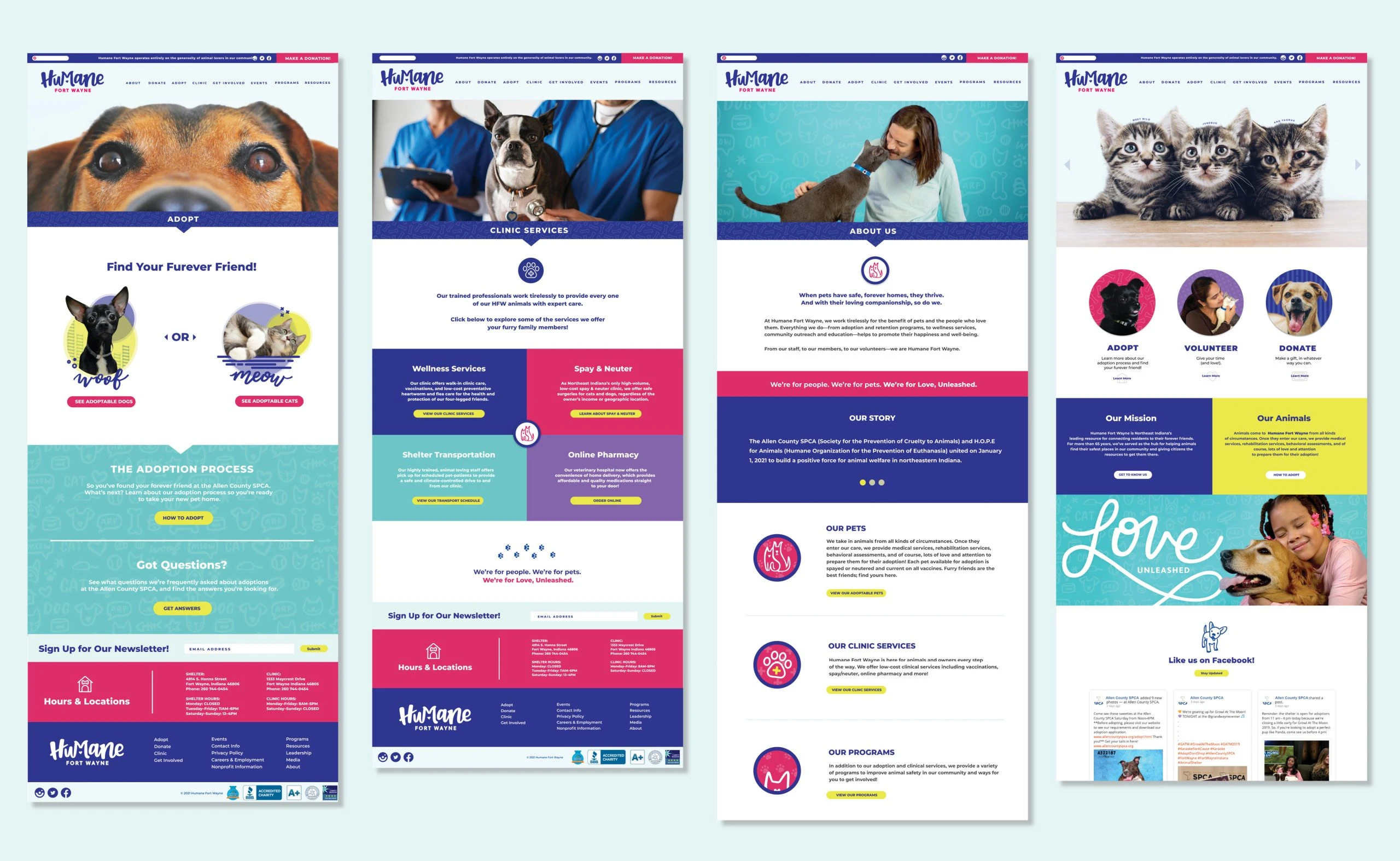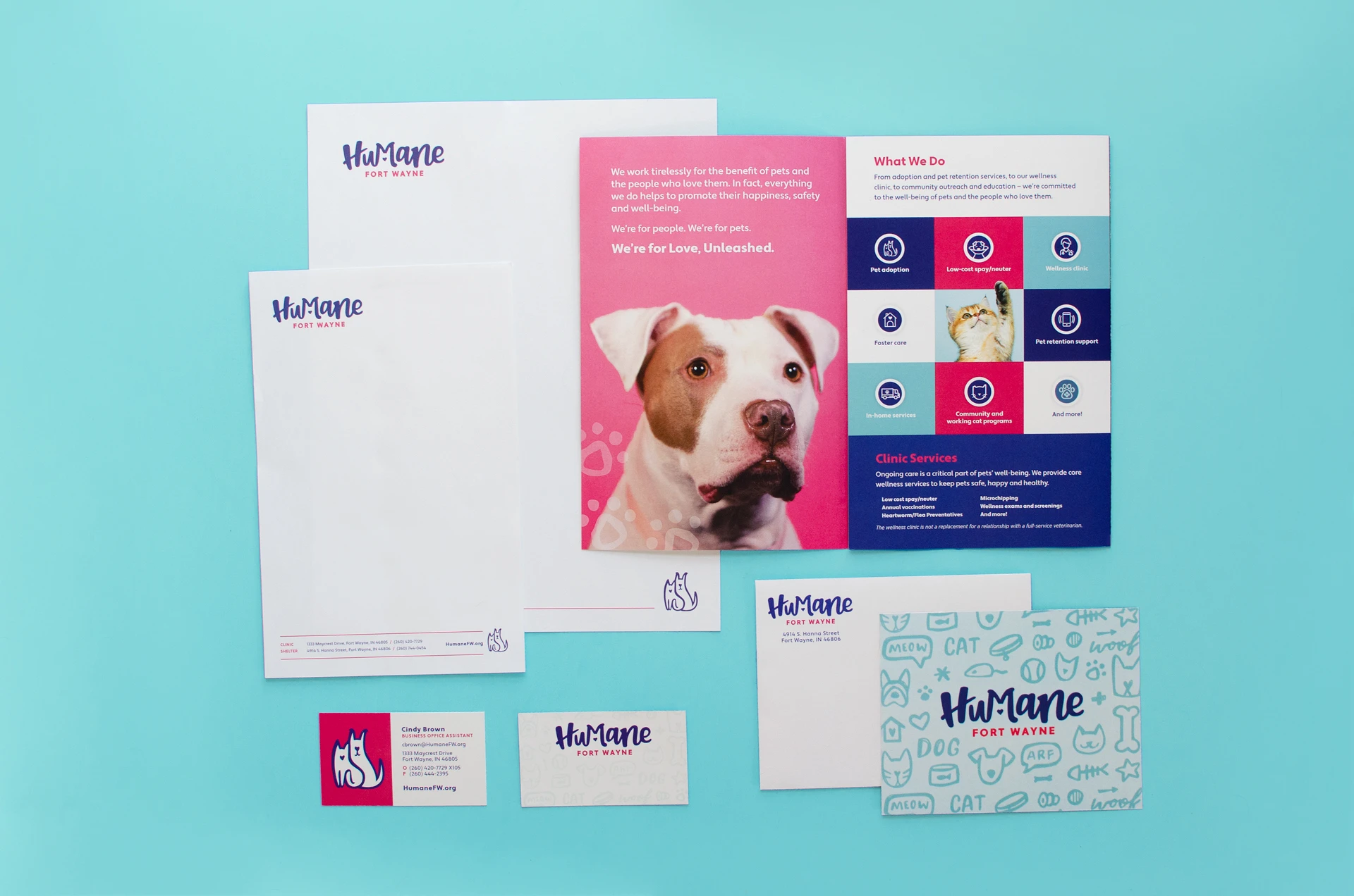 Throughout this process, we found ourselves in all sorts of adorable situations—getting hugs from friendly dogs and mastering our temporary job descriptions of “cat wranglers” on set—which are everyday activities for Humane Fort Wayne. This colorful, bright and refreshing new visual identity directly reflects the joyful, passionate and playful personalities that make up the Humane Fort Wayne team and the animals that they care for.
