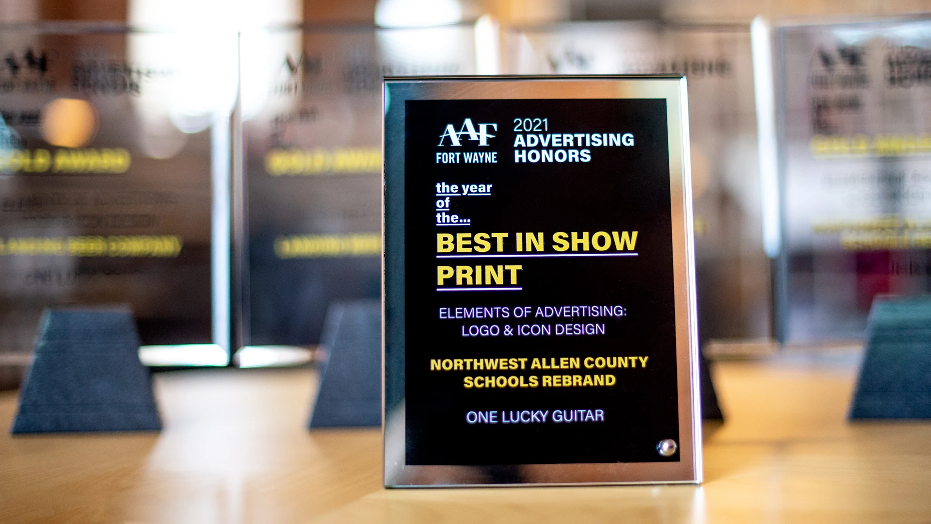 At the American Advertising Federation of Fort Wayne’s 2021 Advertising Honors (Ad Honors, formerly “Addys”), One Lucky Guitar was recognized with Best in Show and Gold Awards for the Northwest Allen County Schools (NACS) rebrand.