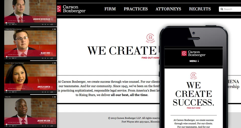 I enjoy building typography-driven websites. Using language and type as a design element can be a powerful thing. It’s true that an image says a thousand words, but sometimes a thousand words isn’t what you want. What you really need to know is that Carson Boxberger is committed to creating success for their clients. Starting with the homepage, you can see that message very clearly. Although the site is type-heavy, the personality and warmness of the firm isn’t lost. You’ll see photos of the new space sprinkled throughout the site, along with video bios, so you can get to know the attorneys. And if you’re on the go, you can browse the specially formatted version of the website for mobile and tablet devices.
